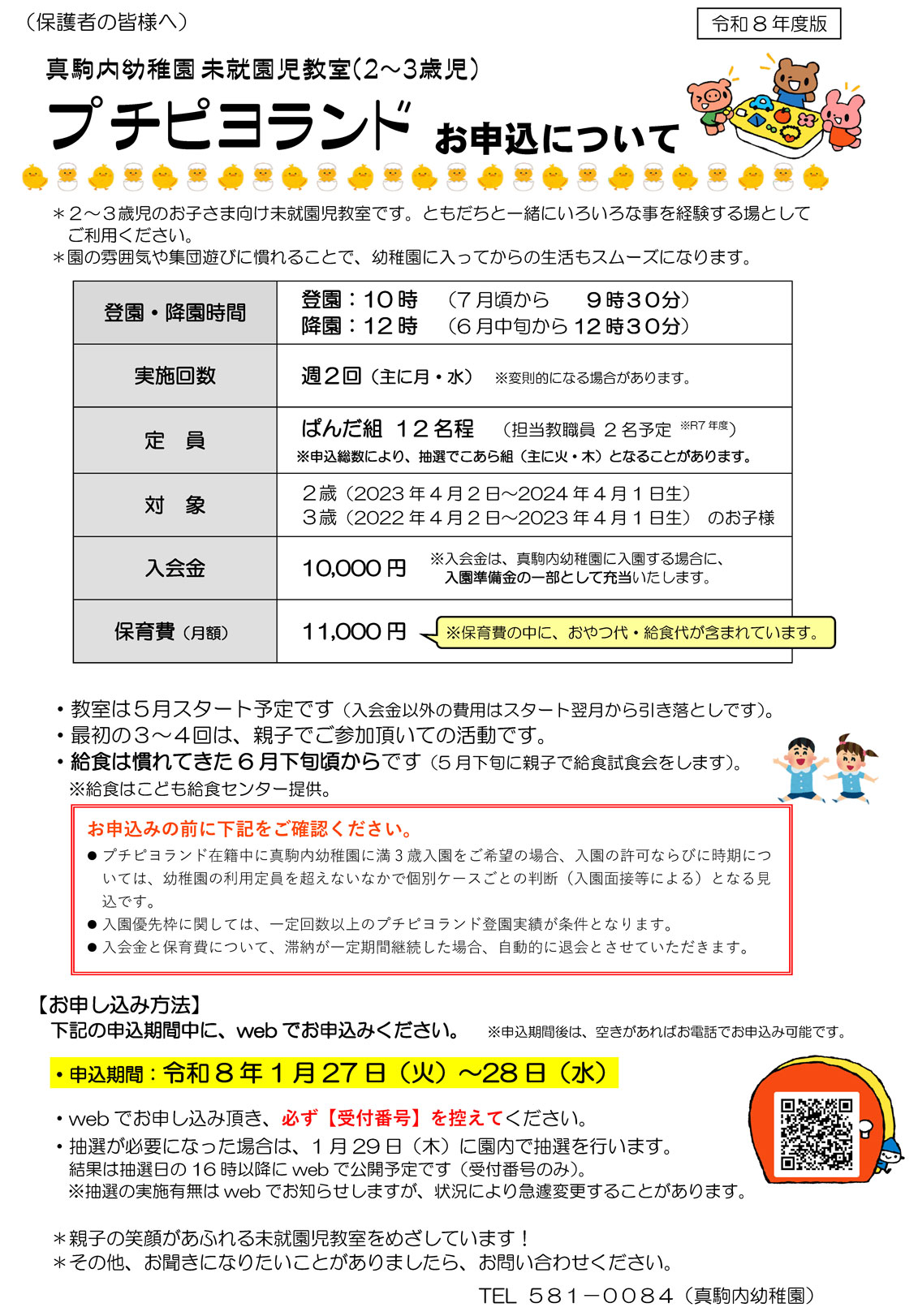 真駒内幼稚園の「未就園児教室 プチピヨランド」は、毎年5月からスタートいたします。 大切な幼児期、ともだちと一緒にいろいろな事を経験する場としてご利用下さるよう、お待ちしております。 幼稚園の雰囲気や集団遊びに慣れることで、幼稚園に入園するときもスムーズです。 親子の笑顔があふれる、そんな未就園児教室を目指しています!